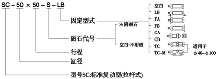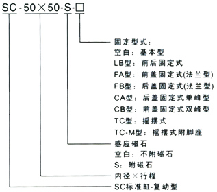 1)欲订购缸径为50mm,行程为100mm,附磁,采用TC固定型式的标准复动型(拉杆式)气缸,其正确的订购码代码为:SC-50X100-S-TC. 2)欲订购缸径为63mm,行程为150mm,附磁,采用LB固定型式的标准复动型(拉杆式)气缸,其正确的订购码代码为:SC-63X150-S-LB.