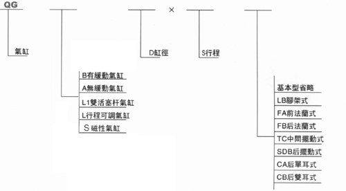 例:您如需订购,缸径Φ125行程,有缓冲带脚架的气缸时请在订单上写清:QCB125X250-LB型.